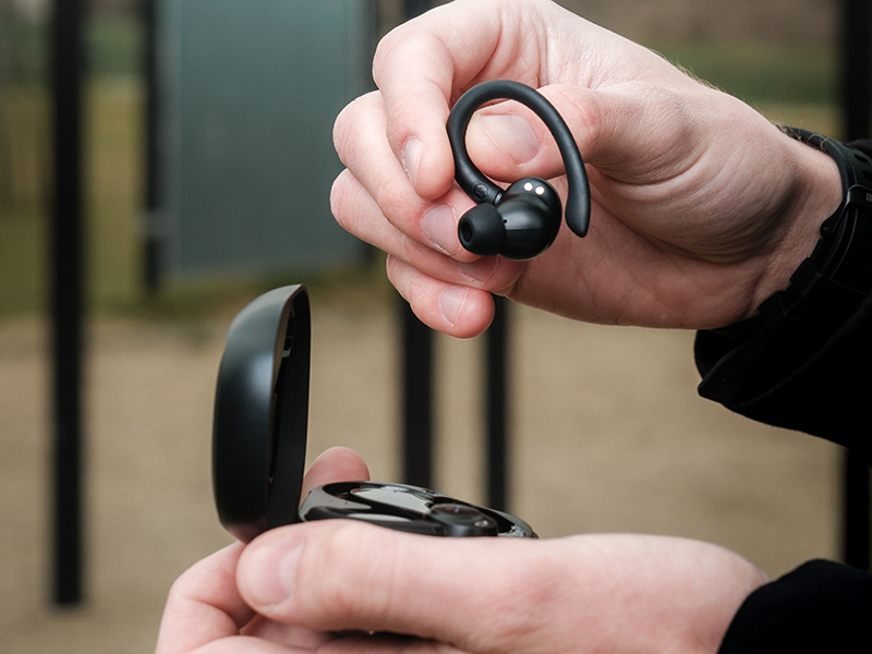 The handy charging case protects the earbuds and allows you to quickly recharge them anywhere – at work, on the go, or during your daily activities.