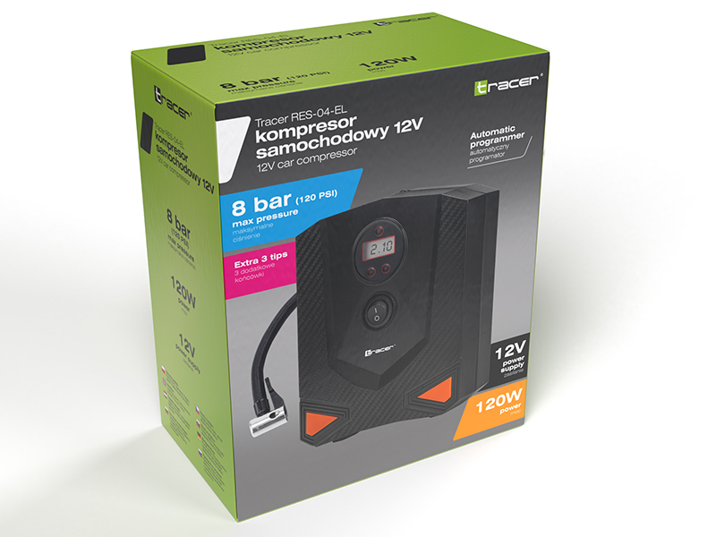 Powered by 12V and boasting 120W of power, the TRACER RES-04-EL compressor ensures quick and effective tire inflation in your car. With a maximum pressure of 8 bar and a 17 mm metal cylinder, it's ready for any road challenge.